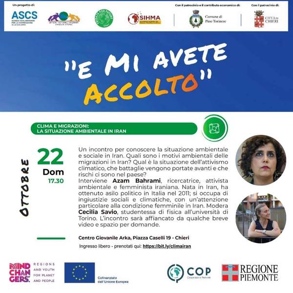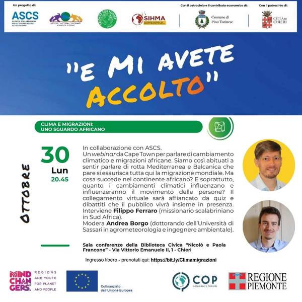 Il progetto WeCareForClimate ha come soggetto capofila ASCS, associazione da sempre attiva in materia di migrazioni che vuole aprirsi in questa circostanza anche al tema del cambiamento climatico. Si prevede una stretta collaborazione con i soggetti associati: il Comune di Chieri, l’UPM, l’AGM e lo SHIMA; inoltre, sarà coinvolto il gruppo FFF Chieri. Il progetto ha come obiettivo la sensibilizzazione e l’attivazione di giovani del territorio in materia di migrazioni, cambiamento climatico, con particolare attenzione alla loro connessione. Sono previste rassegne culturali, campi di volontariato, incontri di formazione e una costante comunicazione social.